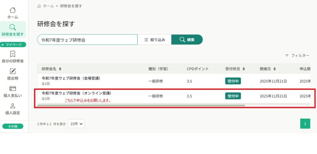 研修会当日の午前9時以降に、研修管理システム マナブルにて「令和7年度ウェブ研修会(オンライン受講)」を検索のうえ、申込みを行ってください。